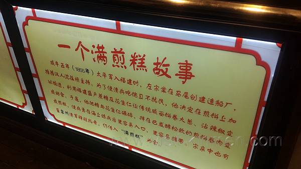 咸豐五年(西元1855年)太平軍入福建時,左宗棠在馬尾創建造船廠,推薦漢人沈葆楨主持。為了使清軍吃飽不擾民,他決定在煎餅上加以改進,利用福建盛產的蔗糖及花生仁,讓傳統鹹麵餅皮捲大蔥、沾辣椒醬的吃法,變成了甜食。於是,他把蔗糖、花生仁碾碎,拌入已發酵鬆軟的煎餅捲內變成煎糕。使戰士在海上操練後更容易入口,也更容易攜帶。其宗親中亦有至泉州駐紮的,乃傳入”滿煎糕”為食。